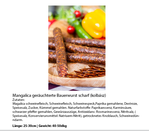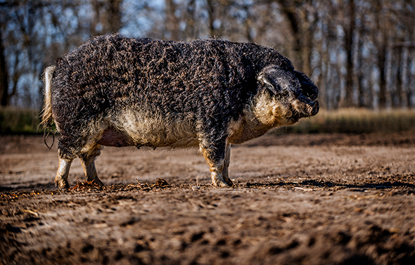 Mangalitza-Schweine ernähren sich von den Körnern und Getreidearten die in den Nationalparks gedeihen. Auf der Szomor Ökofarm bekommen die Tiere kein Kraftfutter beigemischt, womit die Tiere zwar langsamer wachsen, aber Fleisch von außergewöhnlichem Geschmack und Qualität geben. Das Fleisch ist reich an mehrfach gesättigten Fettsäuren und Vitamin E. Mangalitza kommen sehr gut mit extremen Witterungsbedingungen zurecht, sind widerstandsfähig für Krankheiten und müssen, nicht so wie Tiere in Intensivhaltung, nicht mit Antibiotika behandelt werden.